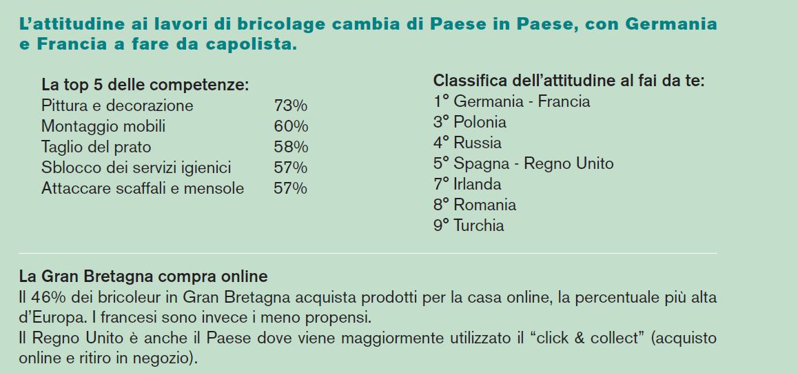 4) L’attitudine dei cittadini europei verso il fai da te e la loro capacità di intraprendere determinati lavori, varia enormemente da Paese a Paese. Ad esempio, i tedeschi sono i più propensi a intraprendere un importante lavoro strutturale, mentre in Turchia ci sono i bricoleur meno esperti. Gli inglesi contnuano a essere “i giardinieri d'Europa”, mentre i polacchi sono i più abili nell'installazione di un sistema di riscaldamento centralizzato.