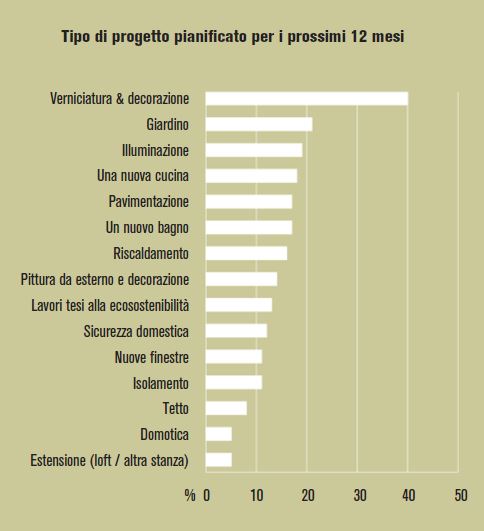 Gli europei sono più propensi a spendere per i miglioramenti della casa (47%) rispetto ad altre opzioni come ad esempio una macchina (29%) o una vacanza (44%). In media, gli europei stanno elaborando tre progetti nei prossimi 12 mesi, con la Russia che ha in programma il numero maggiore (4) e la Francia quello minore (2,2). Le prime cinque voci di spesa previste per la casa nel corso dei prossimi 12 mesi saranno pittura - decorazione (40%), interventi in giardino (21%) e illuminazione (18%), seguiti da una nuova cucina (17%) e arredamento in generale (18%). Interessante notare come l’acquisto di prodotti per la casa venga stabilito principalmente dal fattore prezzo (73%), seguito dalla qualità (56%).