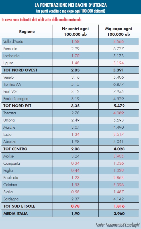 Analizzando il numero di abitanti in rapporto ai punti vendita di ogni regione, possiamo evidenziare che in Italia ci sono 1,9 negozi e 3.960 mq