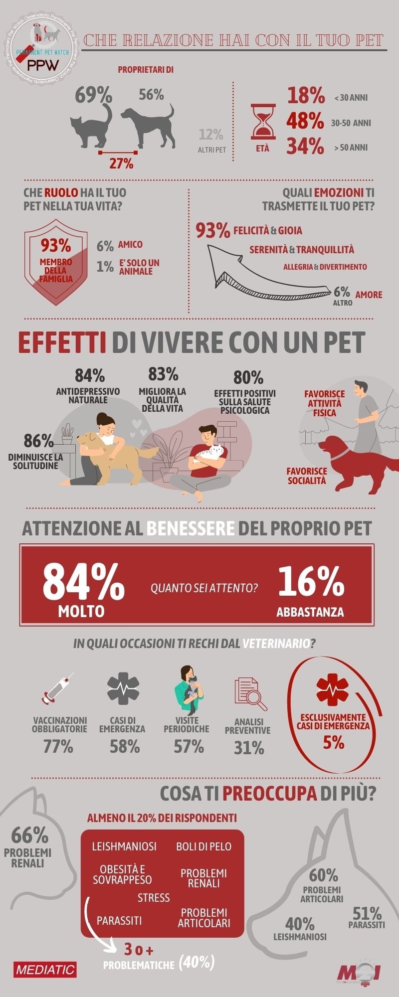 Quasi 4 intervistati su 4 (93%) - tra proprietari di cani, di gatti e di altri piccoli animali, prevalentemente donne, di età compresa tra i 30 e i 50 anni - dichiarano che il proprio pet è un membro della famiglia.Il proprio animale da compagnia trasmette soprattutto felicità e gioia. Lo conferma la maggioranza delle persone (51%), ma anche serenità e tranquillità per un 28%, allegria e divertimento per un 14%.