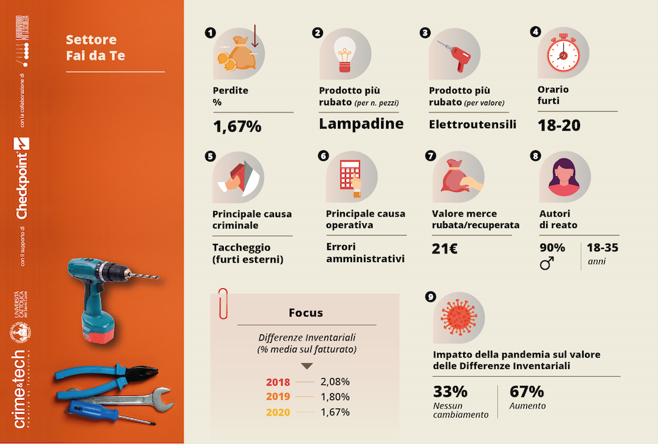 In uno scenario di sostanziale stabilità per il comparto DIY, lo studio La Sicurezza nel Retail in Italia 2021, realizzato da Crime&tech, spin-off dell'Università Cattolica del Sacro Cuore, con il supporto di Checkpoint Systems Italia e la collaborazione del Laboratorio per la Sicurezza, ha indagato per il settore del fai da te l’andamento, e quindi anche l’impatto della pandemia, sullo shrinkage e fatto emergere un aumento rispetto all’anno precedente (+ 1,67%), dato che ha posizionato la categoria di retail tra le più colpite dal fenomeno, insieme a Supermercati, Ipermercati e Discount.
