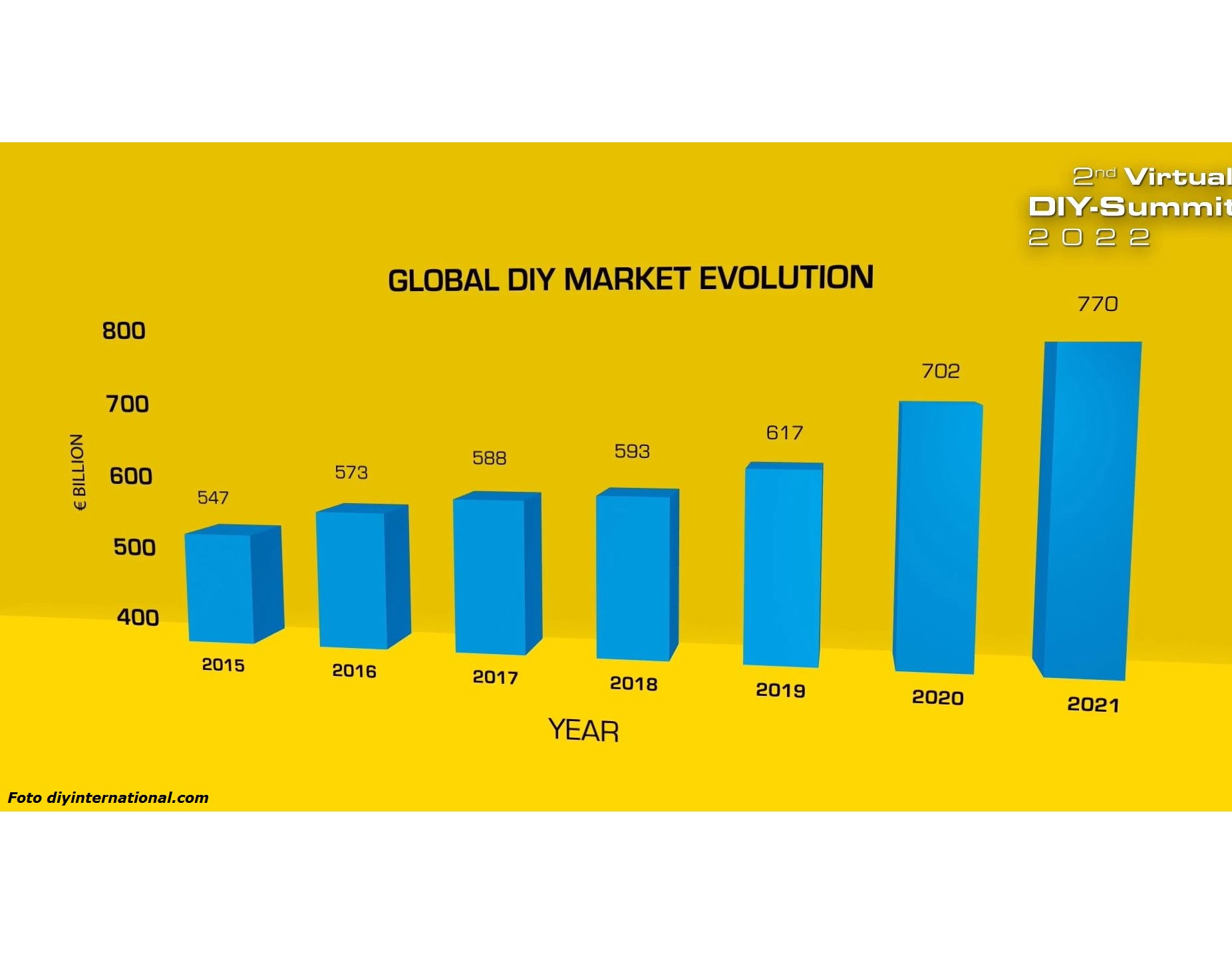 Il mercato DIY nel 2021 vale 770 miliardi di euro, quasi 70 mld in più rispetto al 2020, quando aveva chiuso a 702 mld complessivi. Numeri importanti che testimoniano la straordinaria crescita del comparto negli ultimi anni, causa pandemia: indicativa la crescita nel biennio 2021-2019 (+153 miliardi) se paragonata ad esempio al biennio 2019-2017 (l'ultimo pre-covid) che aveva fatto registrare un aumento di "solo" 29 miliardi.