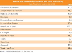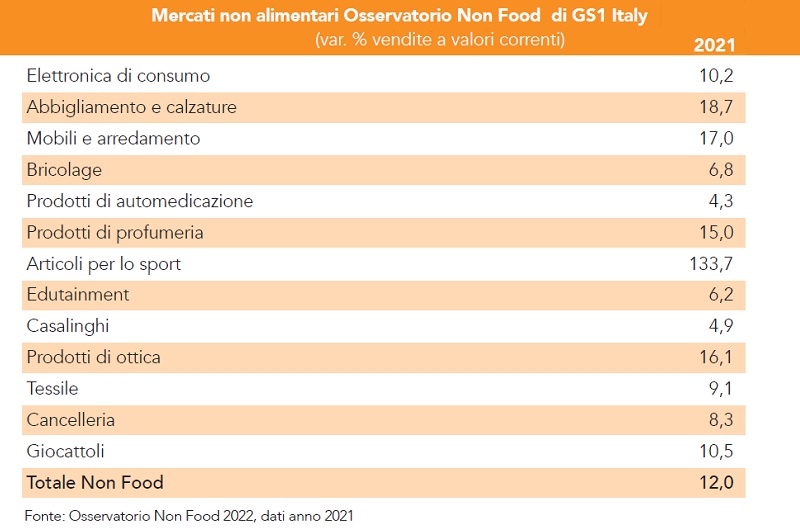 Le vendite di prodotti non alimentari tornano a crescere nel 2021: è questa la fotografia scattata dall’Osservatorio Non Food 2022 di Gs1 Italy, lo studio che ogni anno, da vent’anni, offre uno sguardo d’insieme, ragionato e trasversale del mondo non alimentare, analizzandone i consumi, i canali di vendita, le tendenze, il consumatore tipo, tra innovazioni tecnologiche e trasformazioni del mercato.
