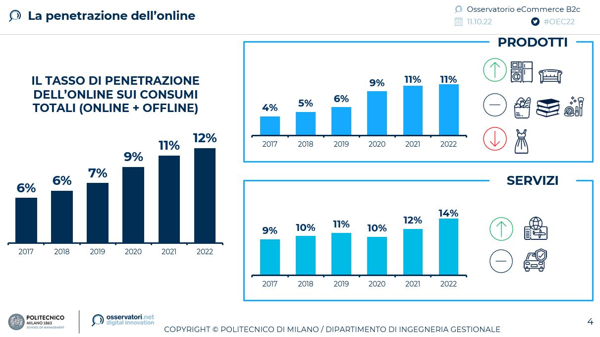 “L’instabilità geopolitica, la crisi della supply chain, così come il ritorno alla piena attività dei negozi fisici, stanno influenzando la dinamica dei consumi in Italia, totali e online” aggiunge Valentina Pontiggia, Direttrice dell’Osservatorio eCommerce B2c “L’eCommerce di prodotto, dopo due anni di crescita ‘straordinaria’, si trova in una fase di evoluzione più strutturata e controllata. Nel 2022 rimane stabile (11%) la penetrazione dell’eCommerce sul totale Retail nei prodotti, mentre aumenta (dal 12% al 14%) quella nei servizi”.