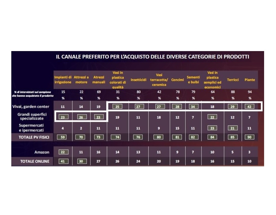 Tra i canali fisici spiccano i garden center e i vivai per l’acquisto di vasi, insetticidi, concimi, sementi, terricci e piante e le grandi superfici specializzate (come i centri bricolage) per l’acquisto di irrigazione e attrezzi manuali e motorizzati. La Gdo (super e iper) svolge un ruolo importante per la vendita di vasi in plastica economici e di terricci (per prezzo e parcheggio).