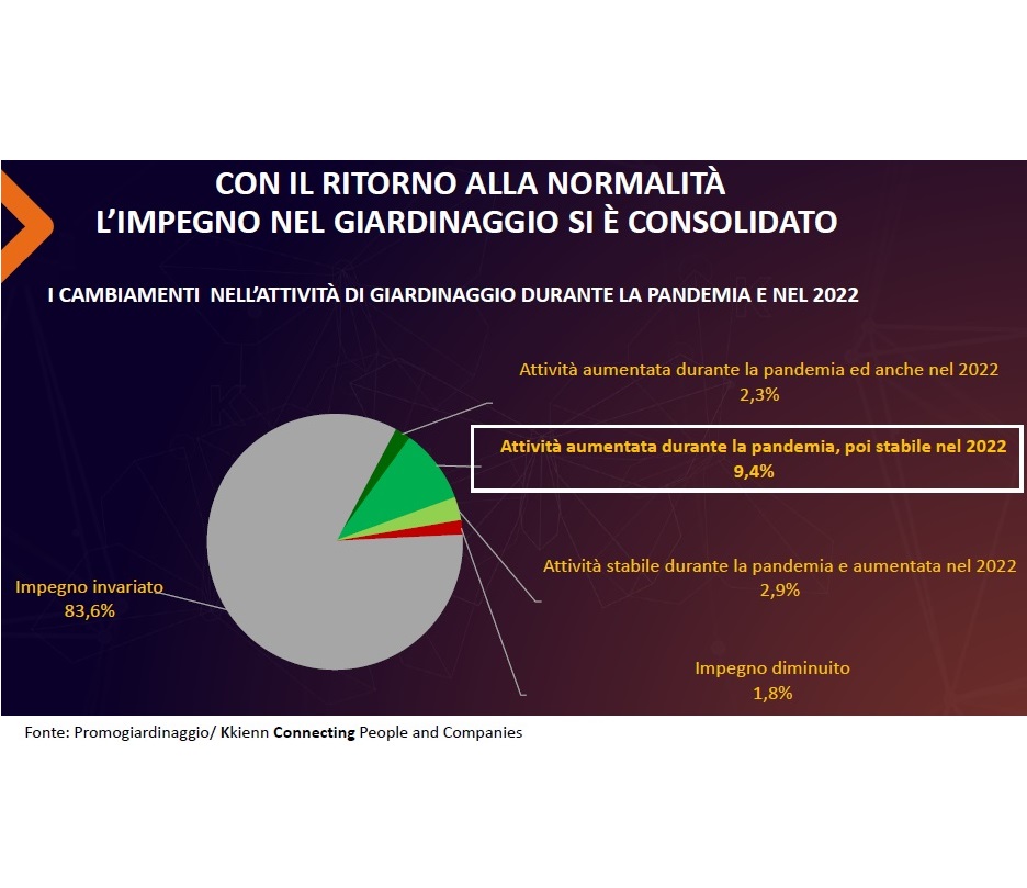 L’obbligo a passare più tempo in casa negli anni della pandemia ha fatto nascere molti nuovi consumatori di prodotti per il giardinaggio. La diminuzione delle vendite nel 2022 ha indotto in molti operatori un dubbio: una volta tolti i divieti, quanti neo-green lovers hanno abbandonato l’hobby della coltivazione? Sembra siano molto pochi. La nuova ricerca di Promogiardinaggio ha indagato anche questo aspetto ed emerge un consolidamento della passione: solo l’1,8% ha diminuito l’impegno nel giardinaggio nel 2022, mentre per l’83,6% è rimasto stabile e per il 2,3% è addirittura aumentato. Rispetto alla pandemia c’è però una riduzione delle attività che richiedono molto tempo, come per esempio la coltivazione dell’orto sul balcone.