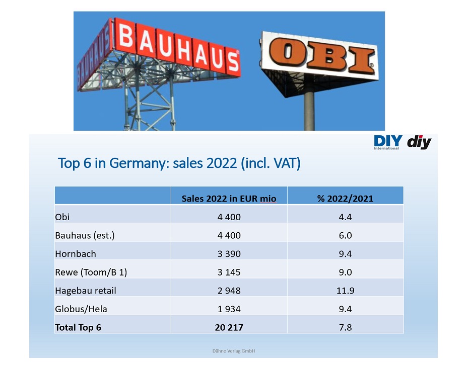 Nel mezzo c'è Rewe con i negozi Toom e B1 e l'attività di vendita al dettaglio Hagebau, che ha raggiunto il più alto tasso di crescita tra le prime sei nel 2022, con l'11,9%.
