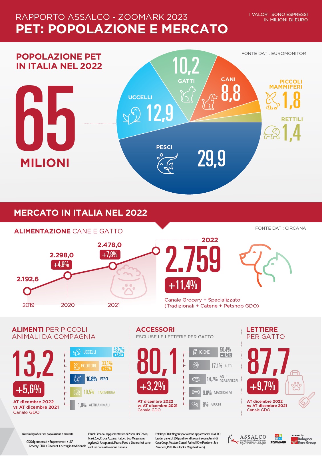 Secondo le stime Euromonitor, in Italia sono presenti quasi 30 milioni di pesci, 13 milioni di uccelli e quasi 3,2 milioni tra piccoli mammiferi e rettili. Nel 2022 il mercato degli alimenti per questi animali da compagnia è cresciuto a volume del 2,3% e a valore del 5,6%, sviluppando un fatturato di quasi 13,2 milioni di euro presso la Grande Distribuzione Organizzata.