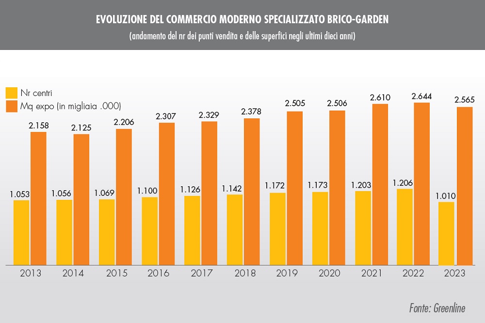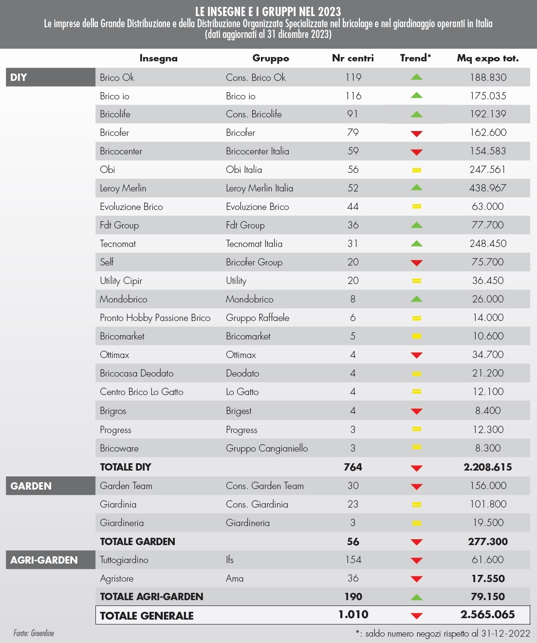 Il 2023 si chiude con 1.010 punti vendita attivi legati a 26 gruppi distributivi, pari a 2,565 milioni di mq espositivi; gli oltre cento negozi in meno di Tuttogiardino generano un calo del -3% delle metrature espositive rispetto a fine 2022. Anche al netto di questa catena, i dati danno ugualmente un risultato negativo: -8% rispetto ai 1.206 negozi attivi nel 2022.
