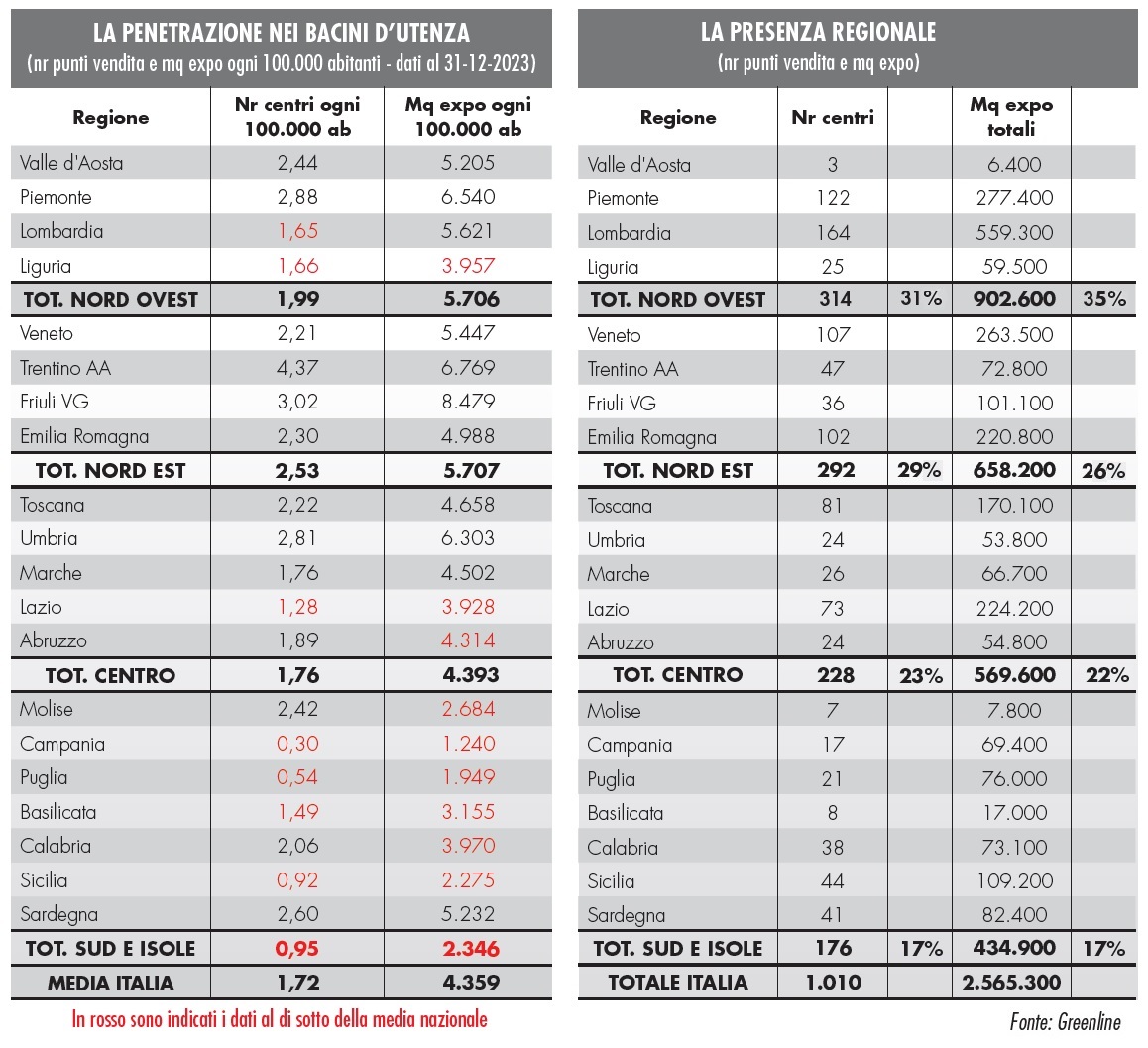 Gli italiani hanno a disposizione 1,72 negozi e 4.359 mq espositivi ogni 100.000 abitanti. Leggermente in calo rispetto ai 4.372 mq del 2022. Per poter confrontare le performance delle varie regioni, rileviamo che nel nord troviamo un’offerta di oltre 5.700 mq ogni 100.000 abitanti, con i picchi del Friuli (8.479 mq), del Trentino (6.769 mq) e del Piemonte (6.540 mq), mentre nell’area “sud e isole” scende a 2.346 mq ogni 100.000 abitanti, trainata verso l’alto dalla performance della Sardegna (5.232 mq) superiore alla media nazionale. Le regioni del centro Italia sono invece allineate alla performance nazionale totale: 4.393 mq ogni 100.000 abitanti.
