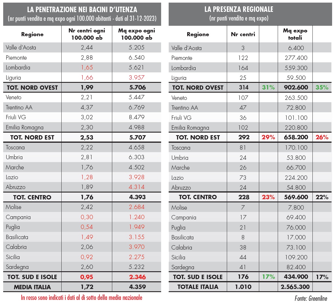 Se analizziamo soltanto i centri bricolage, scopriamo invece una distribuzione sul territorio più omogenea e razionale. Dei 764 centri diy attivi nel 2023 “solo” il 52% si trova nel nord (32% nel nord-ovest e 20% nel nord-est), il 27% è nelle regioni del centro e il 21% nell’area “sud+isole”. Se prendiamo in considerazione le superfici espositive, le percentuali del nord salgono leggermente: sono il 57% del totale nazionale, con il centro al 24% e il sud al 19%.