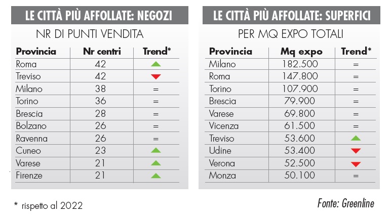 Nel 2023 sono Roma e Treviso le città con il maggior numero di punti vendita legati alla rete della Gds: entrambe contano 42 negozi, ma Roma ha 147.800 mq espositivi Milano è la terza città per numero di punti vendita, ma è al primo posto per la superficie espositiva totale con 182.500 mq, pari al 7% della superficie totale.
