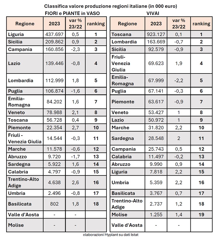 Il centro Italia guida le produzioni nazionali (oltre il miliardo e 200 milioni di valore), trainato come da tradizione dalla performance della regione Toscana che mantiene saldamente il primato delle produzioni vivaistiche nazionali (con una quota che supera il 50% del mercato) con un fatturato alla produzione vicina al miliardo: 923 milioni di euro (+0,1% sul 2022). Un dato che, aggregando i valori produttivi del vivaismo e della floricoltura (altri 56,7 milioni di euro, +0,4% sul 2022), porta la Toscana a guidare in solitaria il comparto. Leggera decrescita per il Lazio, altra regione-chiave dell’area, che chiude il 2023 a quota 190,4 milioni (-0,3%, ma con segno positivo per le produzioni floricole).Segue il Nord Italia, con valore espresso di oltre 1 miliardo e 180 milioni. A trainare le regioni settentrionali, la Liguria ‘regina dei fiori’ con oltre 437 milioni solo di produzioni floricole e quasi 8 di colture vivaistiche; poi la Lombardia, in leggera contrazione (-0,7%) nel vivaismo a quota 163 milioni e in campo positivo per le coltivazioni floricole (113 milioni, +1,8%).