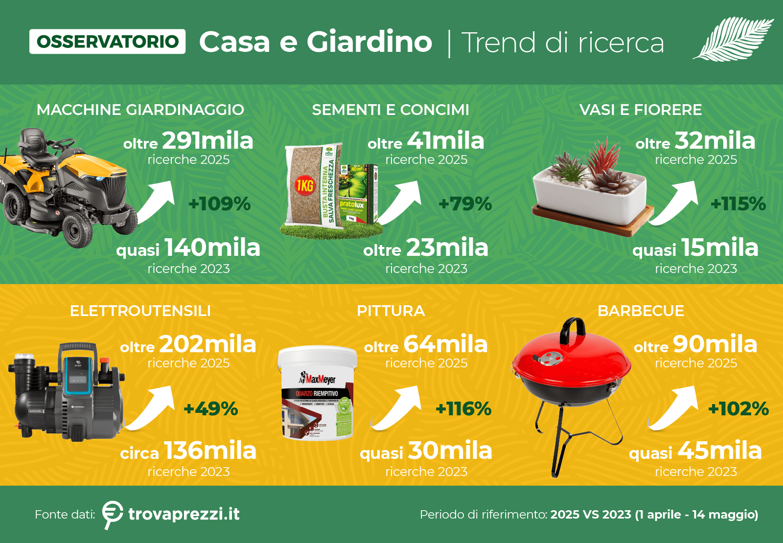 La conferma arriva dai dati analizzati da Trovaprezzi.it, il comparatore di prezzi leader in Italia, che ha registrato una vera e propria impennata di ricerche online dedicate ai prodotti per la cura della casa e del giardino durante i mesi di aprile e maggio 2025 (1 aprile - 14 maggio).