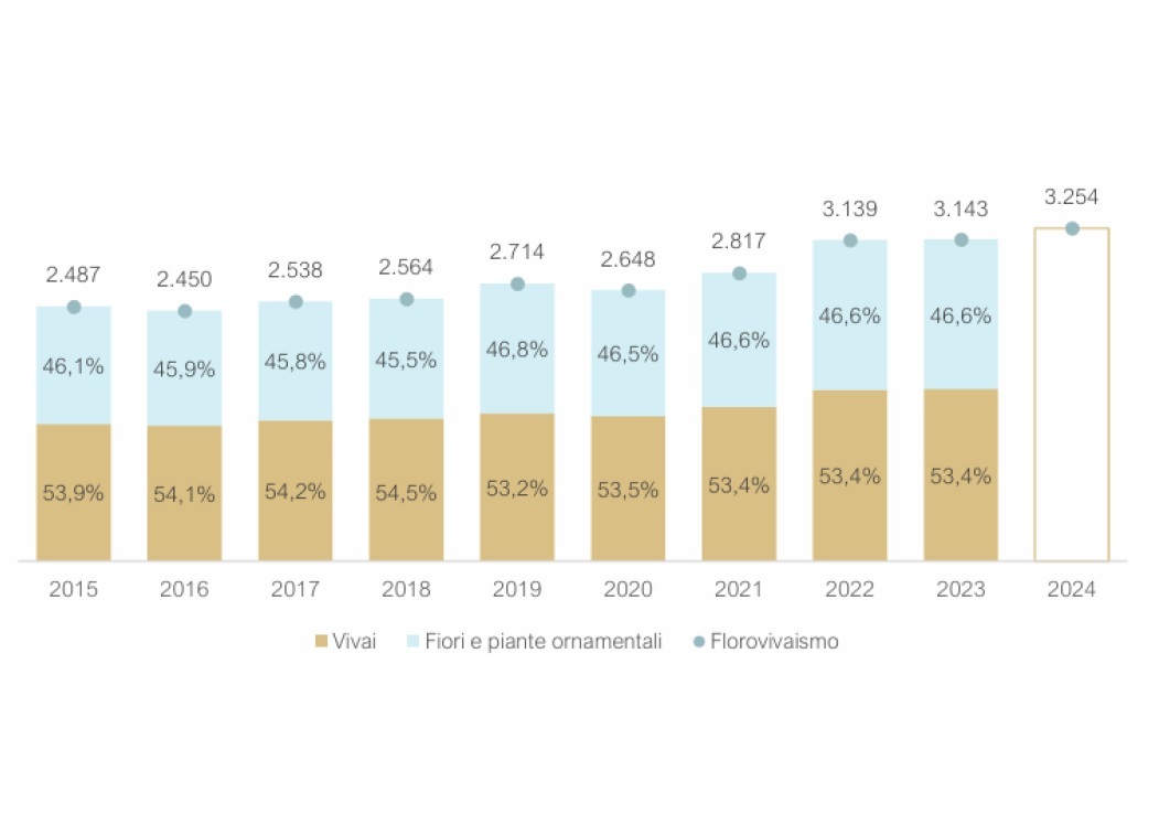 Il 45,5% proviene dall’attività floricola, che ha toccato 1,5 miliardi di euro (+3,5% rispetto al 2023).