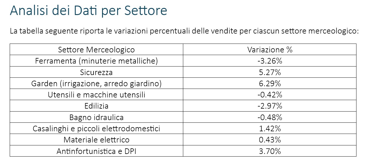 I dati evidenziano una contrazione nei comparti legati all'edilizia (-2,97%) e alla ferramenta (-3,26%), coerente con il rallentamento del settore edilizio.