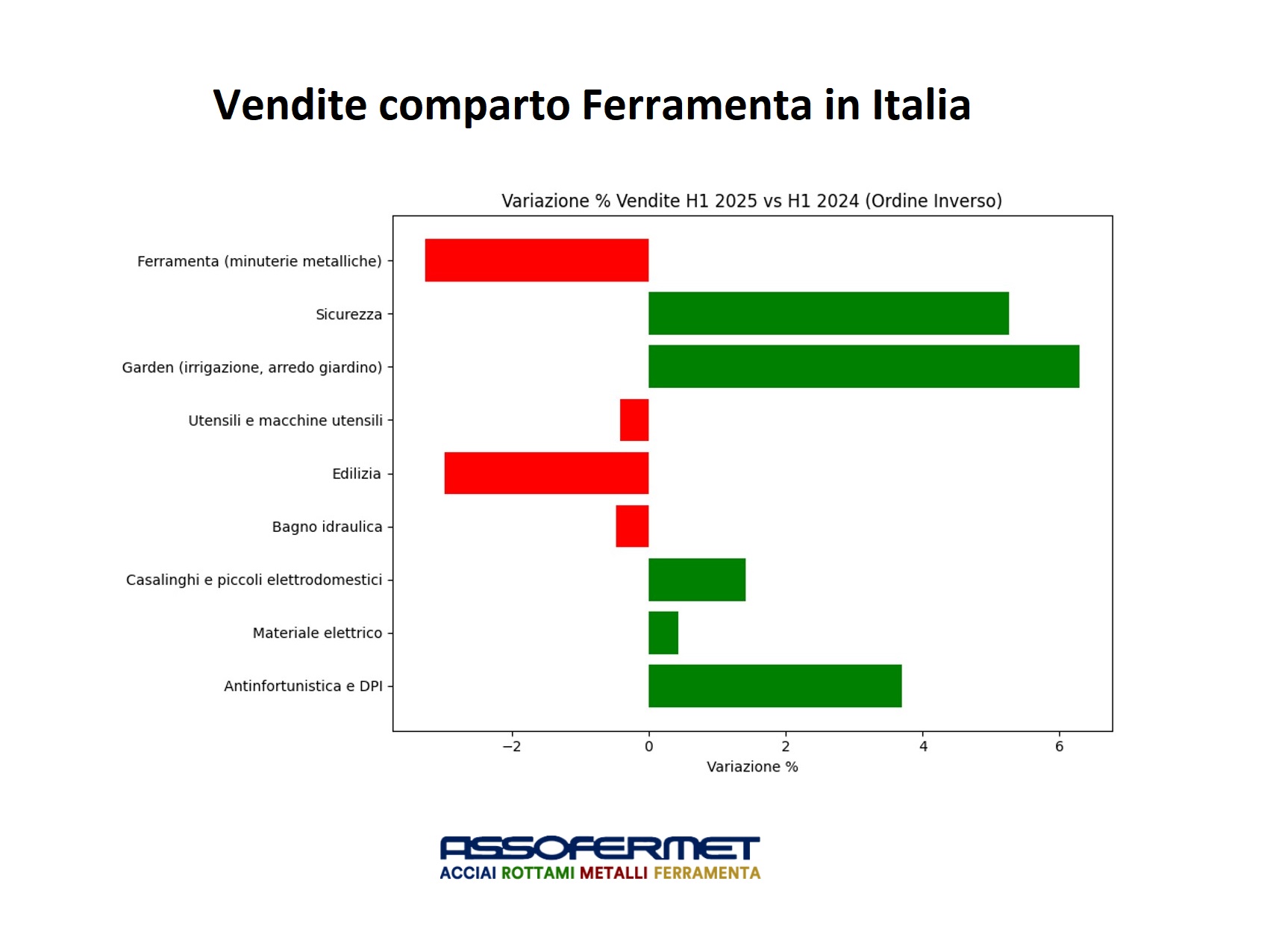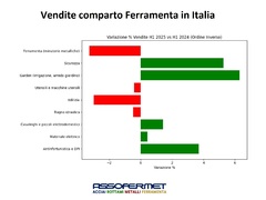 Assofermet ha analizzato l'andamento delle vendite del comparto Ferramenta nel primo semestre 2025, rispetto allo stesso periodo del 2024, suddiviso per settore merceologico.