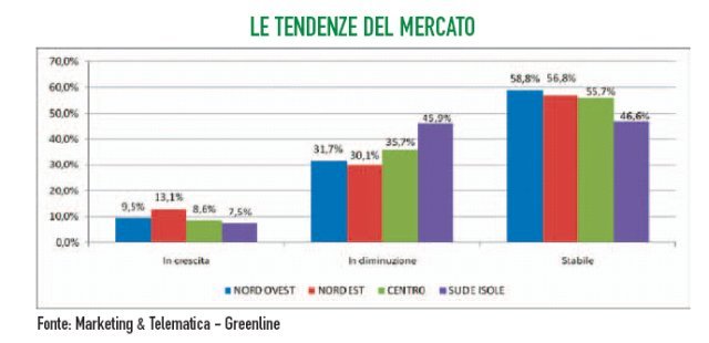Sicuramente l’andamento percepito dai negozianti è un indicatore immediato dello stato del canale. Le sensazioni che prevalgono sul trend del lavoro sono di stabilità (54%), seguite da una diminuzione delle vendite (37%). I più ottimisti sono nel Nord-Est (13,1%), mentre al Sud si concentrano le maggiori difficoltà (dichiarazioni di calo del lavoro al 45,9%).
