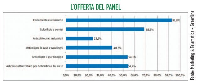 Il 93% delle ferramenta, tratta merceologie tipiche, il 68,5% anche prodotti da colorificio e circa il 54% ha articoli per il fai da te e per il giardinaggio. Il 40% degli intervistati ha anche prodotti per la casa, mentre uno su quattro tratta articoli tecnici industriali.