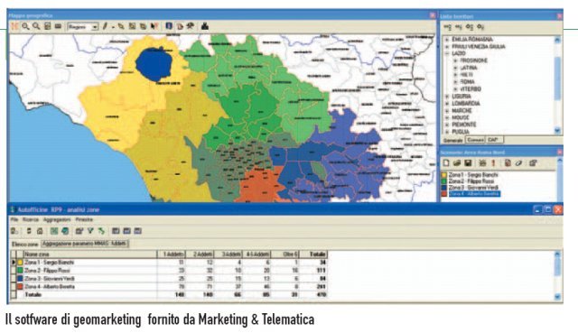 Alessandro Tebaldi: Il Micro Marketing Analysis System è un sistema che consente, dopo aver rilevato telefonicamente informazioni quantitative e qualitative presso ciascun operatore del trade, di gestire con estrema semplicità e con un’interfaccia cartografica nazionale tutti i dati necessari alle attività delle direzioni vendita e marketing (vedi foto in basso: il software di geomarketing fornito da Marketing & Telematica).