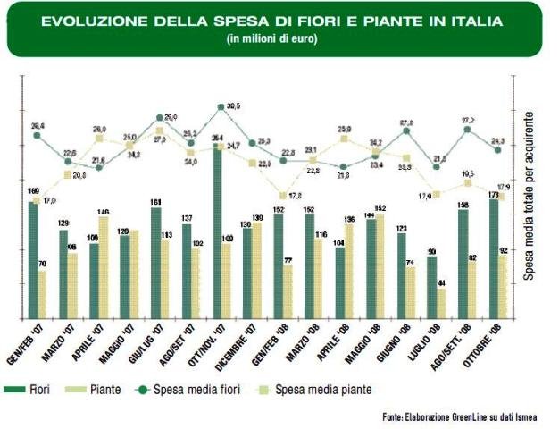 La spesa di ottobre, pari a 173 milioni di euro per i fiori recisi e a 92 milioni di euro per le piante, è senzíaltro in diminuzione rispetto al 2007 (l'entità della diminuzione non si può stabilire poichè nel 2007 la rilevazione è stata condotta sul bimestre ottobre/novembre), in quanto resta consistente la numerosità degli acquirenti ma diminuisce la spesa media per l'intero aggregato (-25% rispetto al bimestre del 2007).