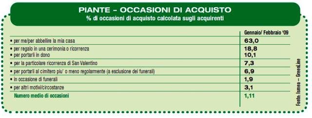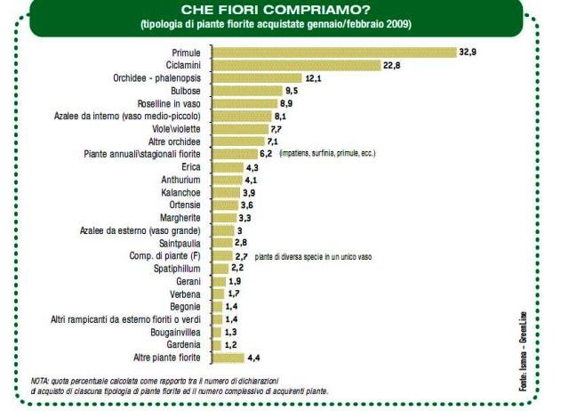 La spesa in fiori, piante, alberi e arbusti, secondo i dati Ismea AcNielsen/CRA, nel bimestre gennaio e febbraio si sono confermati in linea con il medesimo bimestre del 2008 e con il trend precedente: un leggerissimo ma costante aumento dei consumi. Infatti, dal 2005 in poi si è passati da 182 milioni a 250 milioni di euro con una diminuzione solo nel 2008 dopo il picco di 238,5 milioni registrato nel 2007 per l'anomalo inverno con temperature ben al di sopra della media.