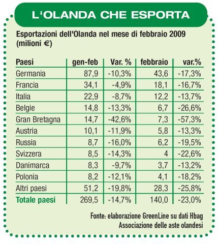 Anche le esportazioni olandesi, fino a febbraio evidenziano come Italia e Francia siano le nazioni in cui acquisti sono scesi molto meno rispetto ad altri Paesi. Frutto forse di un'attenuazione delle aspettative negative per l'evolversi della crisi che ha colpito maggiormente solo determinate fasce sociali.