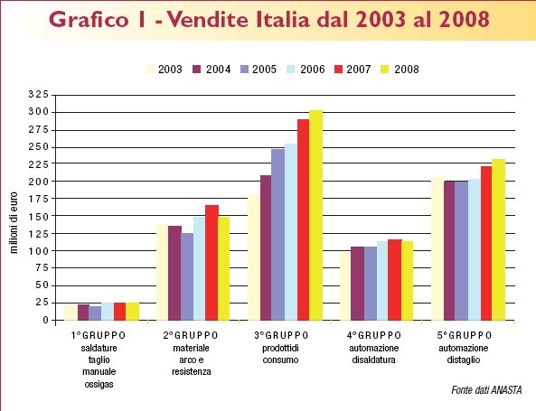Anche il settore saldatura e taglio deve fare i conti con la rapida recessione che coinvolge tutti i mercati e le nazioni. Secondo Anasta (Associazione nazionale aziende saldatura taglio e tecniche affini), le componenti che influiscono sui risultati sono molteplici: dal costo delle materie prime all’andamento dei settori industriali fino alla diversa domanda dei mercati nazionale e mondiale. Le oltre cento aziende che operano sul mercato nazionale producono ed esportano per oltre il 50%, e il fatturato globale del settore saldatura e taglio supera i 1.600 milioni di euro. Mentre le vendite di tutti i settori hanno permesso di chiudere il 2008 con un valore di 820 milioni di euro, in parità con l’anno precedente.
