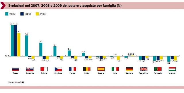 Il calo del potere d’acquisto generato dalla crisi del 2009 (sotto forma di casse integrazioni, licenziamenti e riduzioni dei tempi lavorativi e quindi dei compensi) si va a sommare in Italia a un declino della ricchezza dei ceti bassi e medi iniziata già nel 2001, quando il cambio lira/euro è stato lasciato in balia del mercato senza alcun controllo o tutela della classi più deboli da parte del Parlamento (tutto: governo e opposizione).