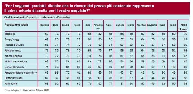 La tabella che ci ha più colpito è quella relativa all’importanza del prezzo: alla domanda “per i seguenti prodotti, direbbe che la ricerca del prezzo più contenuto rappresenta il primo criterio di scelta per il vostro acquisto?” il primo posto se lo è aggiudicato proprio il bricolage, con il 70% di intervistati europei che si dichiara d’accordo o abbastanza d’accordo. Anche in Italia è al primo posto, ma con una percentuale dell’85%: nel settore brico è nettamente la risposta più alta di tutta Europa, seguita dalla Portogallo (82%), dalla Spagna (79%) e dal Regno Unito (78% ma è al terzo posto, preceduto dai “prodotti culturali” e dai “viaggi”).