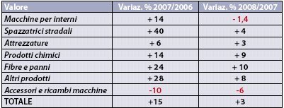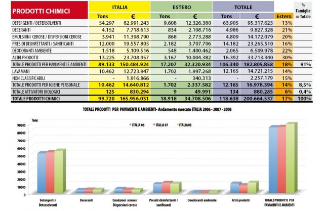 I prodotti chimici sono divisi in tre famiglie: per pavimenti e ambienti, per l’igiene personale e gli attivatori biologici. I primi rappresentano il 91% dell’intero comparto e quindi hanno un peso preponderante nei dati dell’intero comparto. Si è già detto che il settore è cresciuto del 9%, ma un’analisi più approfondita dei dati riserva qualche sorpresa: nel 2007 il valore dell’export era cresciuto del 41% pur registrando una leggera flessione in termini di volume. Dunque a meno quantità di export corrispondevano prezzi più alti dei prodotti. Quest’anno il dato si è pressochè invertito: il volume delle esportazioni è cresciuto del 21%, ma questa crescita ha portato solo un 6% in più di fatturato. In Italia invece il valore è salito del 10%, doppiando il +4% del volume. Complessivamente i prodotti chimici hanno generato più di 200 mln di euro di fatturato per un totale di 118.638 tonnellate, in un settore che è ancora dominato dalla domanda interna (le esportazioni si fermano al 17%).