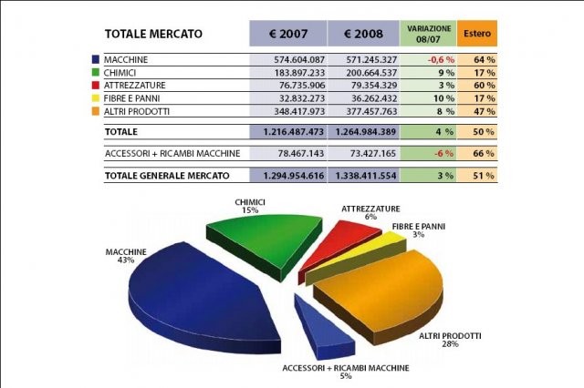 Il comparto macchine, con 571.245.327 di euro e 1.175.540 pezzi ha sostanzialmente confermato le quote di mercato del 2007 (grafico 2); il calo dello 0,6% è completamente ascrivibile alla crisi economica, lo dimostra il fatto che dopo il primo semestre le aspettative erano quelle di registrare la consueta importante crescita. Il costo di ogni singola macchina è salito da 469,56 di euro del 2007 ai 485,94 (un aumento del 3%) assorbendo la diminuzione del 4% in termini di pezzi prodotti.