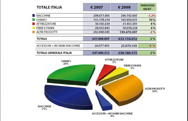 La ricerca è stata suddivisa in cinque macro settori, all’interno dei quali sono state effettuate altre distinzioni. Le cinque aree sono le macchine, i prodotti chimici, le attrezzature, i panni e il resto dei prodotti, come ad esempio dispenser, asciugamani, spazzole. Un conteggio a parte è stato fatto per gli accessori e i ricambi che sono considerati uno spin off del settore stesso.