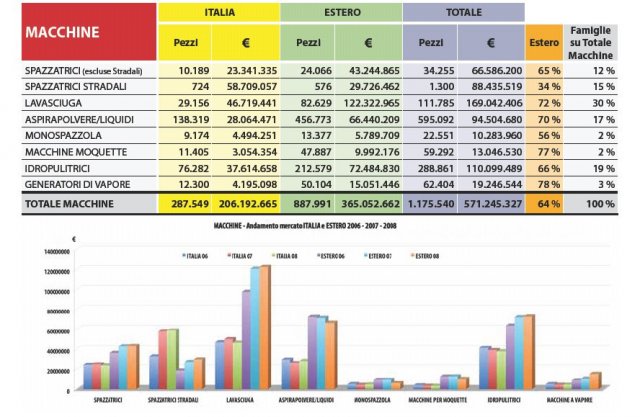 L’Italia si conferma uno dei paesi leader nel settore del cleaning professionale e, nelle macchine ed attrezzature, viene comunemente considerato il più importante produttore mondiale. L’export infatti rappresenta il 51% del totale della produzione, quota che sale oltre il 60 per le macchine e relativi ricambi e per le attrezzature. È statisticamente interessante notare come i dati peggiori siano quelli dei settori con una maggior percentuale di produzione dedicata all’export.