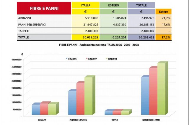 Fibre e panni (grafico 5) invece hanno invece dati più affini al settore dei prodotti chimici. La produzione, oltre 36 milioni di euro di fatturato, è per l’83% destinata al mercato italiano, ma in questo caso la crescita del valore delle esportazioni ha trainato tutto il comparto. Infatti a fronte di una crescita media del 10%, le esportazioni hanno avuto un’impennata (+60%) rispetto ad un 2007 che era stato in calo, mentre il mercato interno si è fermato ad un 4%. Il prodotto dell’anno è stato sicuramente il panno per superfici che ha registrato una domanda pressoché doppia rispetto all’anno precedente (+94% di esportazione). In particolare il panno in microfibra si sta imponendo all’attenzione del mercato perché, anche se più caro rispetto ad altri, consente un notevole risparmio nell’utilizzo dei prodotti chimici.