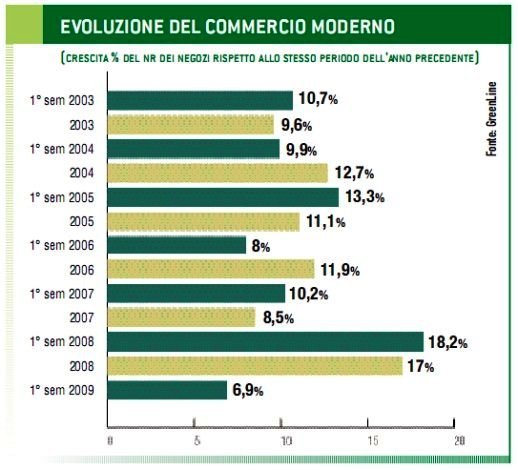 Tradotto in numeri si nota meglio la differenza: nell’ultimo anno (dal 30/6/08 al 30/6/09) la rete è aumentata di 54 punti vendita, mentre negli ultimi due semestri rispettivamente di 118 e 120 negozi.