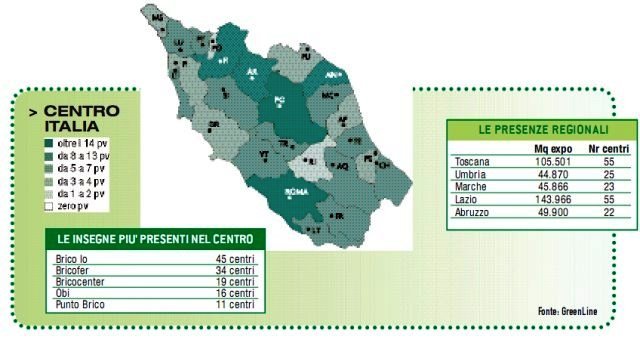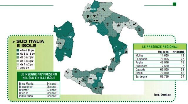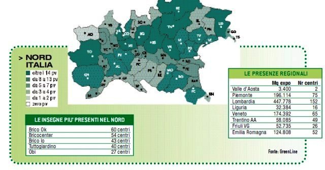 Pur condizionato dalla recessione, il bricolage italiano cresce e aumenta la sua presenza sul territorio. Mediamente in Italia ci sono 3.238 mq espositivi ogni 100 mila abitanti (+9% rispetto ai 2.955 mq del 30 giugno 2008) con picchi oltre i 5.000 mq in Lombardia, Trentino e Umbria. L’ultima della classe è la Puglia, con 1.149 mq ogni 100 mila abitanti, ma va detto che le Regioni del sud hanno fatto registrare la crescita maggiore: lo spazio a disposizione ogni 100 mila abitanti è infatti aumentato del 12% (da 1.705 mq del 30/6/08 ai 1.920 mq attuali), in linea con l’11% del nord ovest, ma meglio del 7% del nord est, del 6% del centro e del 9% di media nazionale.
