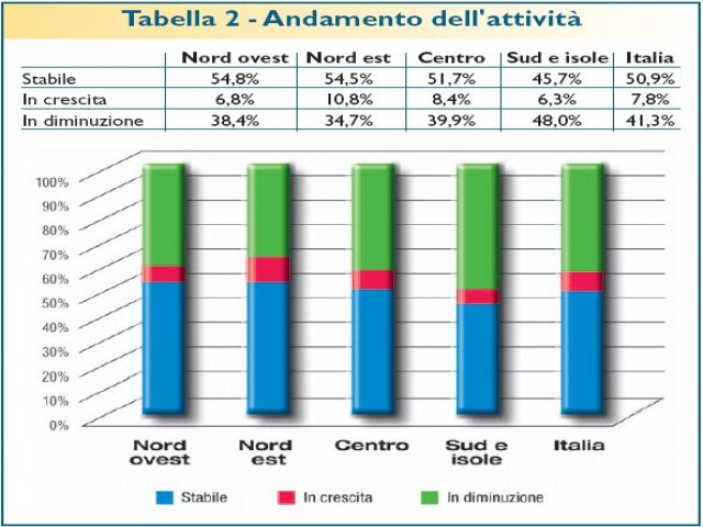 Una ferramenta su due a livello italiano dichiara una andamento dell’attività stabile nell’ultimo anno, il 41% denuncia un peggioramento del trend delle vendite e solo il 7,8% ha messo a segno una performance positiva (tabella 2, grafico 2).