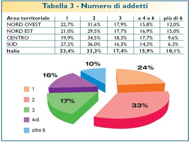Quanto alle peculiarità territoriali, il Nord Est spicca ancora come l’area che accoglie le ferramenta più strutturate anche dal punto di vista delle risorse umane: qui il 15% delle realtà profilate si colloca nella fascia di addetti più elevata; ad essa segue il Nord Ovest (12%) mentre è il Sud a chiudere la classifica (6,3%). Quest’ultima area emerge come quella ove sono più alte le quote di ferramenta con 1 addetto (27,2% contro una media nazionale del 23,4%) e con 2 (36% su un dato medio del 33,3%).