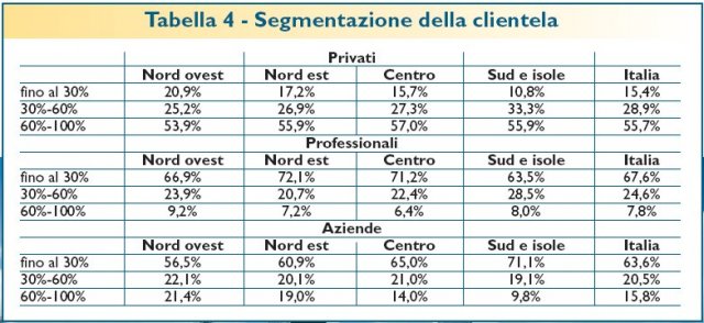 M&T è in grado di definire anche il peso dei clienti privati, dei clienti professionali e delle aziende sul totale della clientela delle ferramenta italiane. Dall’analisi a livello nazionale emerge che i clienti privati nel 55,7% dei casi pesano per oltre il 60% sul totale clientela, mentre solo per il 15,4% delle ferramenta pesano meno del 30%. Per quanto riguarda i clienti professionali, in due casi su tre rappresentano fino al 30% della clientela e solo nel 7,8% dei casi superano il 60%. Valori quasi analoghi per la clientela aziendale, che per il 63,6% dei casi non supera il 30% della clientela.
