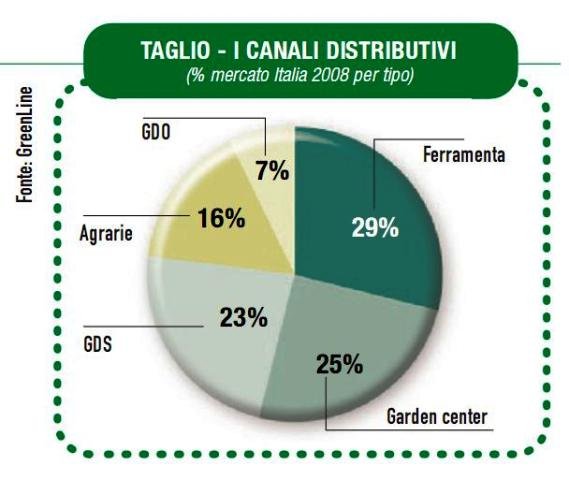 In termini di canali distributivi, la ferramenta perde il 3% sia nel mercato degli attrezzi da taglio sia in quello degli attrezzi da coltivazione e, in parallelo, l'avanzata della GDS e delle agrarie sono, a livello di trend, le novità più interessanti. In valore assoluto, tuttavia, le ferramenta continuano a mantenere la testa della classifica dei canali distributivi, seguite dai garden center.