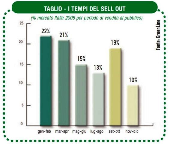 A proposito di tempi di vendita, gli attrezzi da taglio sono meglio ripartiti nell'arco dell'anno, con flessioni nei bimestri centrali dell'estate (luglio/agosto) e di fine anno (novembre/dicembre). Il momento di maggior interesse per le vendite sono i primi quattro mesi dell'anno, in cui si concentra la maggior parte dell'utilizzo.