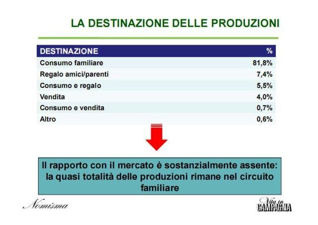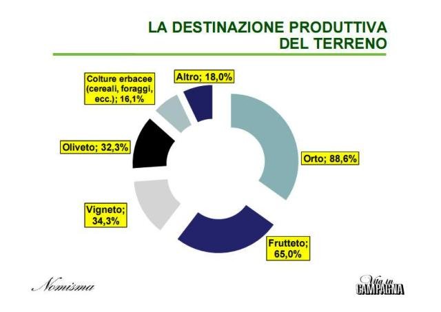 La destinazione produttiva riguarda prevalentemente ortaggi (88,6%), frutta (65%), vite (34,3%) e olivo (32,3%) e, molto spesso, sono completate da processi di trasformazione (ovviamente su piccola scala) per l'ottenimento di conserve vegetali (49,5%), olio (27,5%) e vino (23,7%). In qualche caso poi (circa il 40%) vi sono anche piccole attività di allevamento (in particolare di avicunicoli). I prodotti ottenuti dall'attività di coltivazione e trasformazione sono destinati in via quasi esclusiva all'autoconsumo familiare (81,8%) o a regali ad amici e parenti (7,4%), evidenziando in questo modo l'assenza di rapporti di mercato.