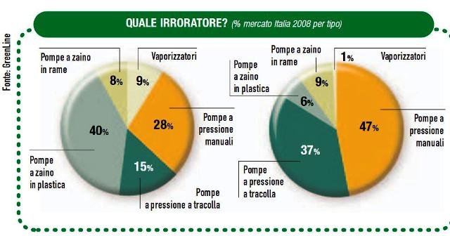 Il comparto dell'irrorazione, che spazia dai piccoli vaporizzatori fino alle pompe a spalla in rame, ha risentito nel 2008 della contrazione dei consumi che sta generalmente toccando tutta l'economia mondiale. Come è successo per quasi tutto il mercato del giardinaggio, è interessante rilevare che la contrazione delle vendite è risultata inferiore rispetto ad altri mercati. Nel 2008 possiamo stimare che il mercato italiano dell'irrorazione abbia sviluppato un giro d'affari di circa 7,3 milioni di euro sell in con circa 2 milioni di pezzi venduti, con una flessione del 3,9% rispetto al 2007.