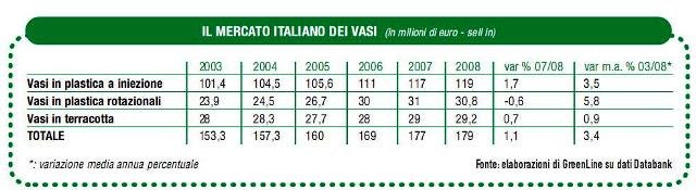 Nel 2008 il mercato italiano dei vasi ha sviluppato un fatturato sell in stimabile in 179 milioni di euro: a produrlo, nell'ordine, i vasi in plastica iniezione (119 mln) e rotazionali (30,8 mln) e i vasi in terracotta (29,2 mln). Rispetto al 2007 l'iniezione è cresciuta leggermente (+1,7%), a differenza del rotazionale (-0,6%): stabilità anche per la terracotta (+0,7%), in ripresa dal 2005; il mercato complessivo dei vasi, nel 2008, ha perciò segnato +1,1%.Per quanto riguarda i canali di distribuzione, la situazione è sostanzialmente stabile rispetto al passato. Vede i garden center in prima posizione (in particolare per il rotazionale): ma se si sommano le quote di GDO e GDS, il distacco per i vasi a iniezione si riduce a un punto percentuale.