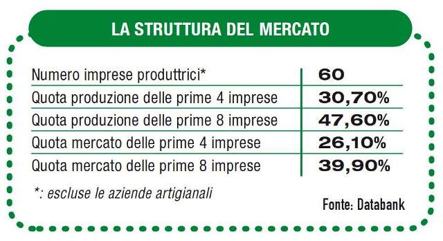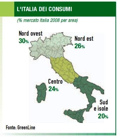 Anche in questo caso l'Italia si presenta a 'due velocità', pur se con una suddivisione meno marcata rispetto ad altri prodotti: il nord non arriva ad assorbire i due terzi della produzione, come accade normalmente (si ferma al 56%), e non è marcato il divario tra centro (24%) e sud (20%).