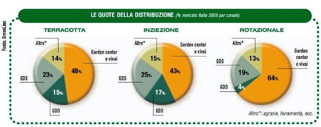 Per quanto riguarda i canali di distribuzione, la situazione è sostanzialmente stabile rispetto al passato. Vede i garden center in prima posizione (in particolare per il rotazionale): ma se si sommano le quote di GDO e GDS, il distacco per i vasi a iniezione si riduce a un punto percentuale.