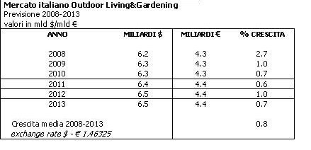 L’analisi degli indicatori economici del settore indica che sulla scia della crescita continua degli ultimi anni, il mercato dell’Outdoor Living & Gardening rimarrà in campo positivo almeno fino al 2013.
