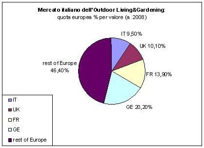 Il mercato italiano dell’Outdoor Living & Gardening nel 2008 corrisponde al 9,5% del mercato continentale che, a sua volta, vale il 39,3% (66 miliardi di dollari circa) del mercato mondiale del settore.