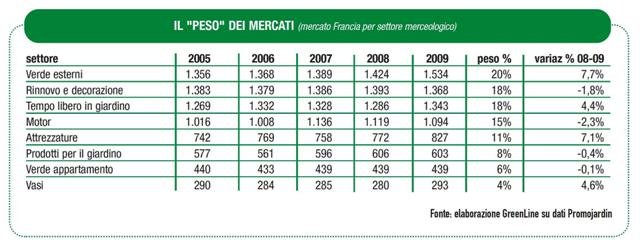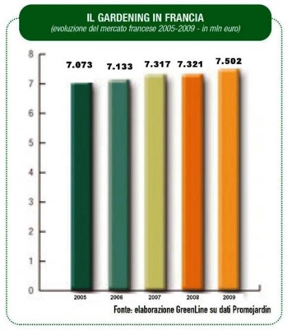 Nonostante la crisi dei consumi e una leggera contrazione dei prezzi, il giro d'affari del gardening francese è cresciuto nel 2009 del 2,5%, passando dai 7,321 miliardi euro del 2008 agli attuali 7,5 miliardi di euro.